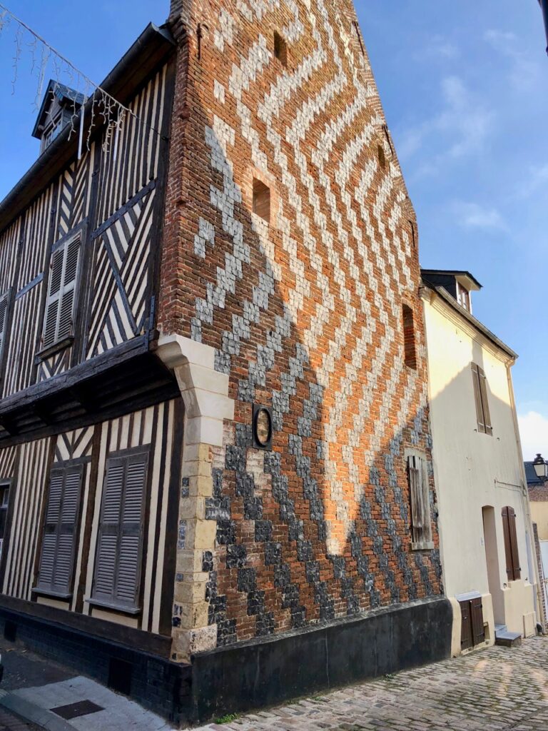 Et admirez les vieiles maisons, comme celle-ci avec son superbe pignon de brique et de silex. Mais aussi sa façade à pan de bois. La Normandie n’est pas très loin…