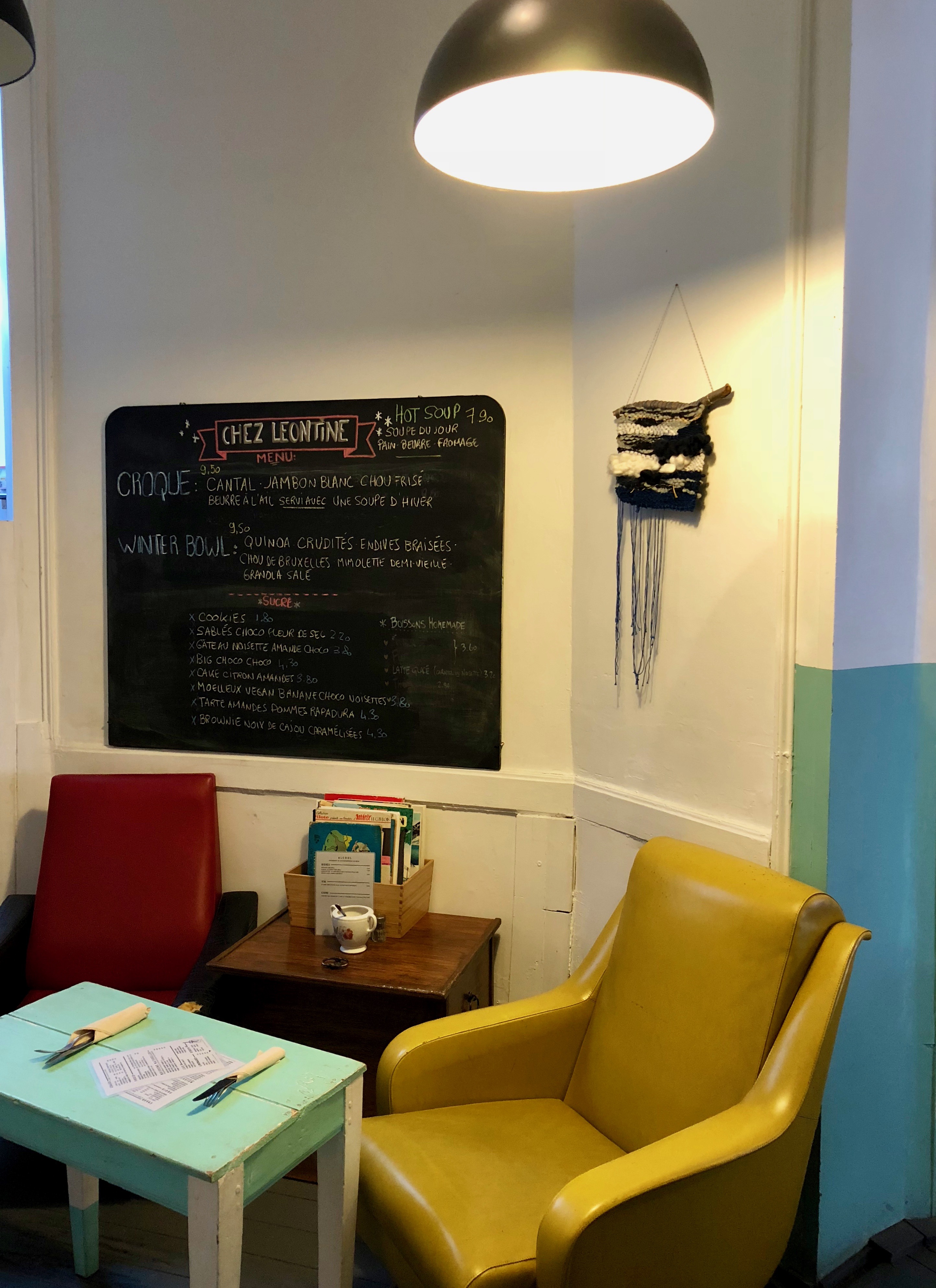 Coin avec fauteuils et menu au mur – au salon de thé Léontine à Lille