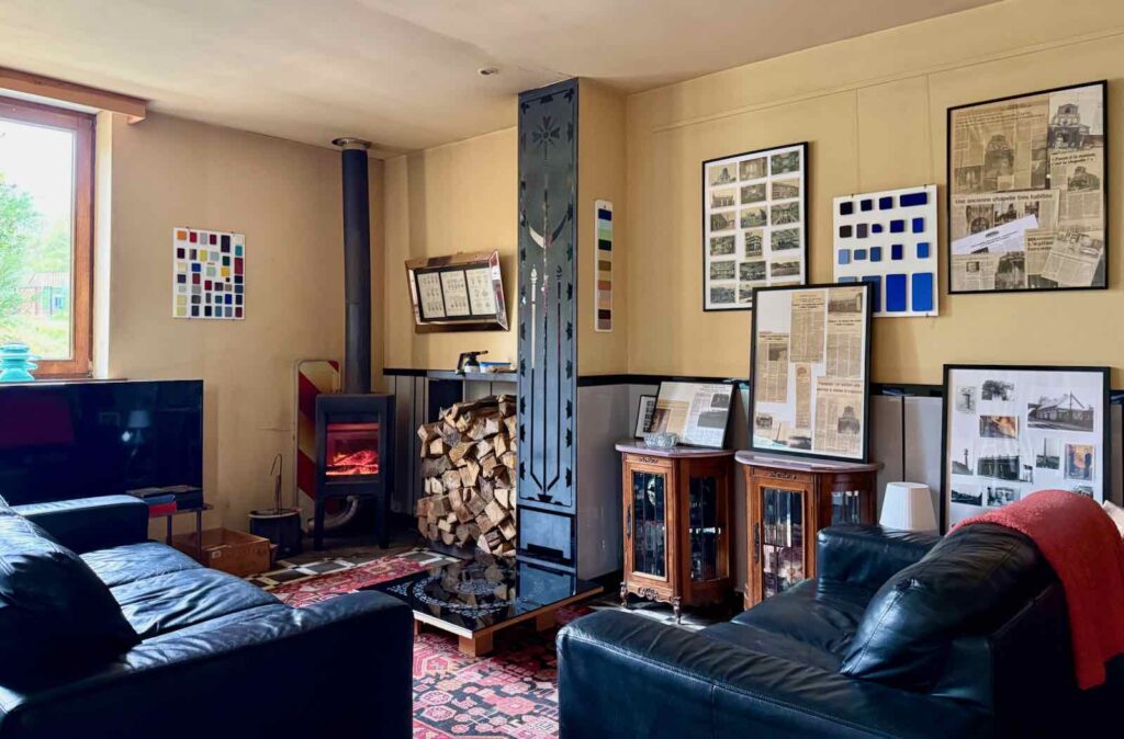 Côté salon, c’est le même esprit récup et bohème qui règne. Deux petits meubles ont été offerts par l’arrière-petite-fille d’Arthur Brancart. De vieux articles et des photos jaunies ornent les murs. Comme d’ailleurs des échantillons des teintes proposées par la verrerie. Un poêle apporte sa chaleur à cette pièce, où le propriétaire a tout fait lui-même, sauf les châssis des fenêtres.