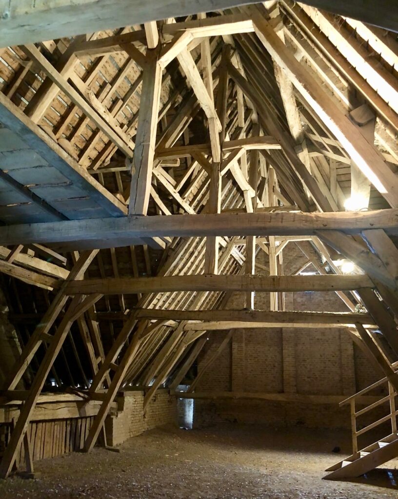 À l’étage, la grande salle refuge permettait à la population de s’abriter en cas d’attaque. Admirez cette charpente de toute beauté, vieille d’environ cinq siècles !