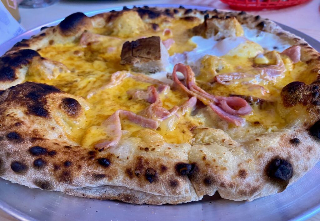 Tandis que moi, j’ai préféré le No(ooo)rd (14 €), une tuerie garnie de cheddar, jambon, œuf fermier et même croutons de pain (sur une pizza, fallait oser !). Pas le genre de truc conseillé par les diététiciennes mais tellement bon, avec sa croûte super croustillante…