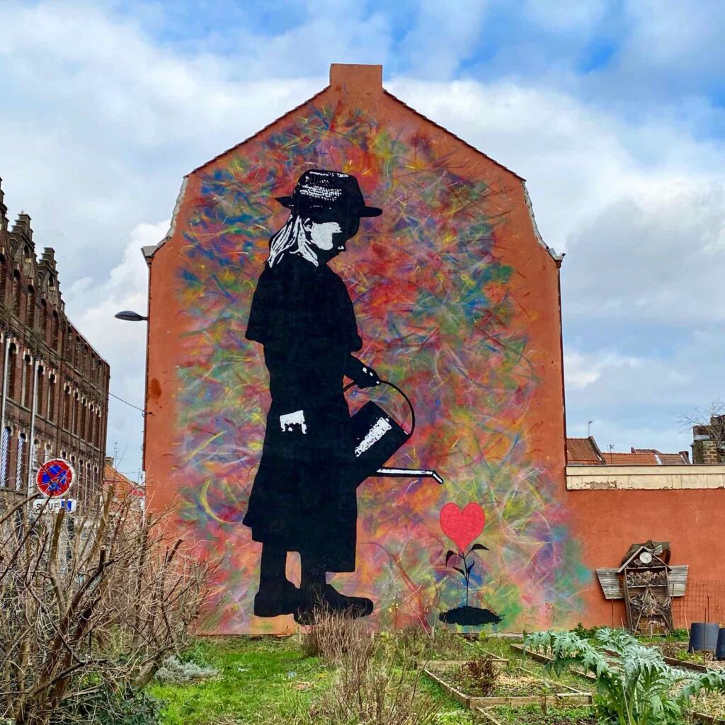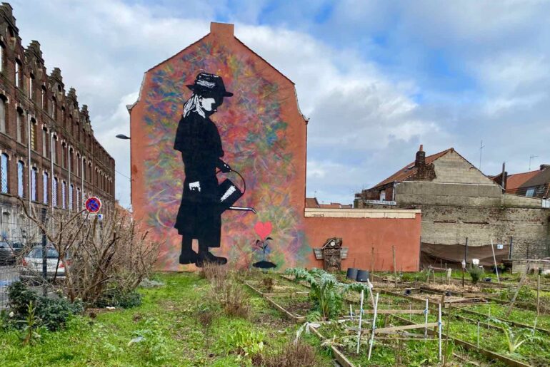 Mais est-ce une raison pour ne pas aimer cette délicate fresque de Ted Nomad, véritable carte de visite du street art à Roubaix, qui va comme un gant à ce pignon surplombant un jardin urbain ?