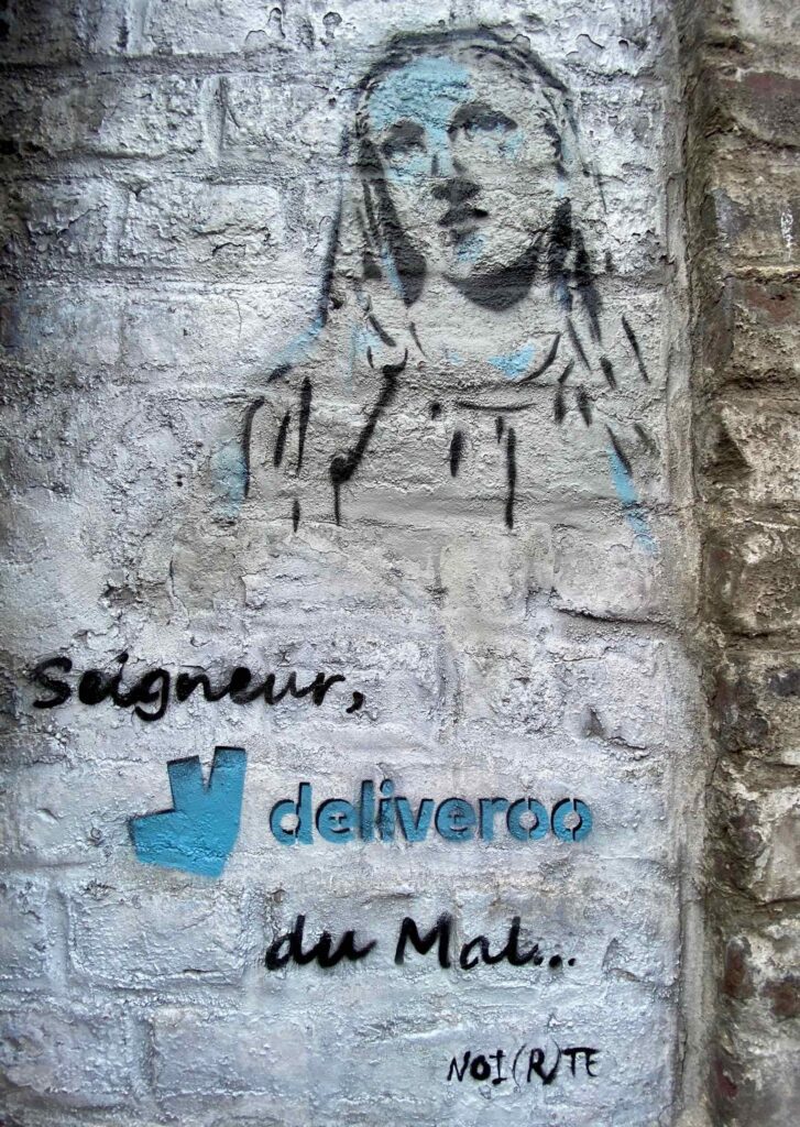 Ce graff du Roubaisien Noir(t)e (réalisé en octobre 2020, si j’en crois son Facebook), né d’une intervention spontanée, ne fait partie d’aucun parcours street art à Roubaix. Je l’ai cependant placé dans mon « top five » pour son côté humoristique et son à-propos, en cette période de Covid, de fermeture des restos et d’activité qui s’envole sur Deliveroo…