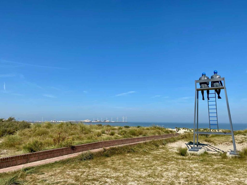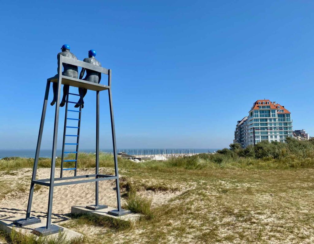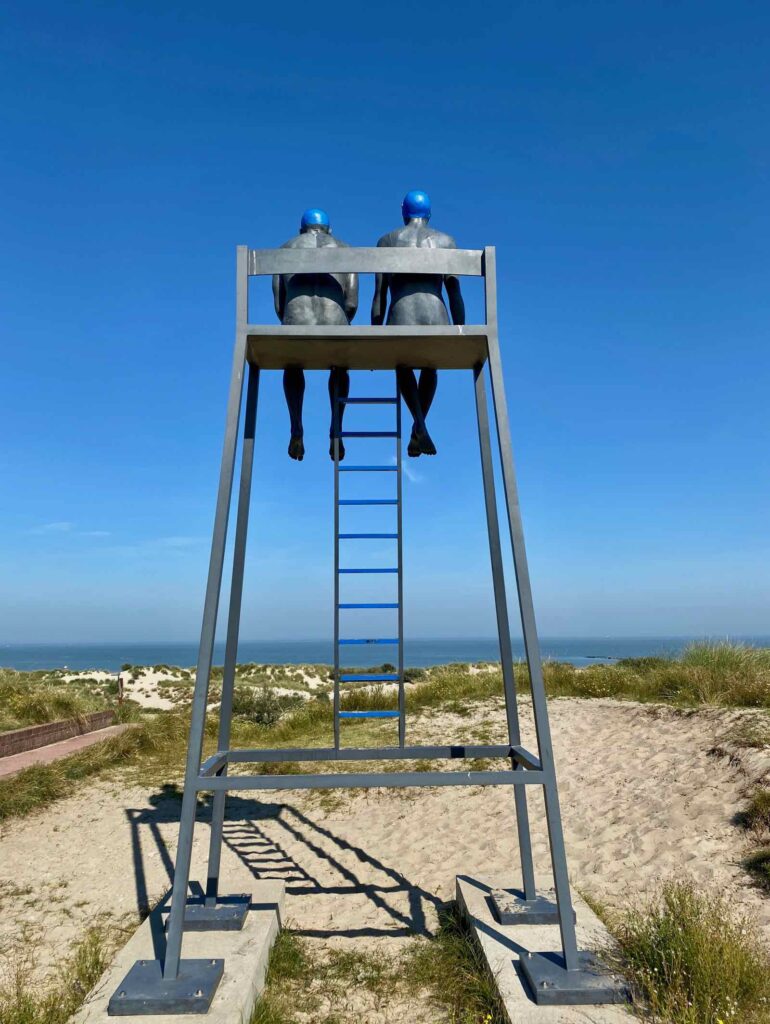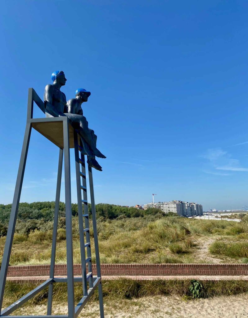 Ce n’est pas l’œuvre la plus simple à trouver mais c’est ma préférée de toutes ! Posée dans les dunes et tournée vers la mer, une chaise haute avec un couple de secouristes qui scrute le large. L’idée est simple mais tellement pertinente ici, à quelques mètres de la mer du Nord. De plus, l’Espagnole Aurora Cañero a un vrai talent pour travailler les corps, que ses personnages soient baigneurs, plongeurs, nageurs ou secouristes…