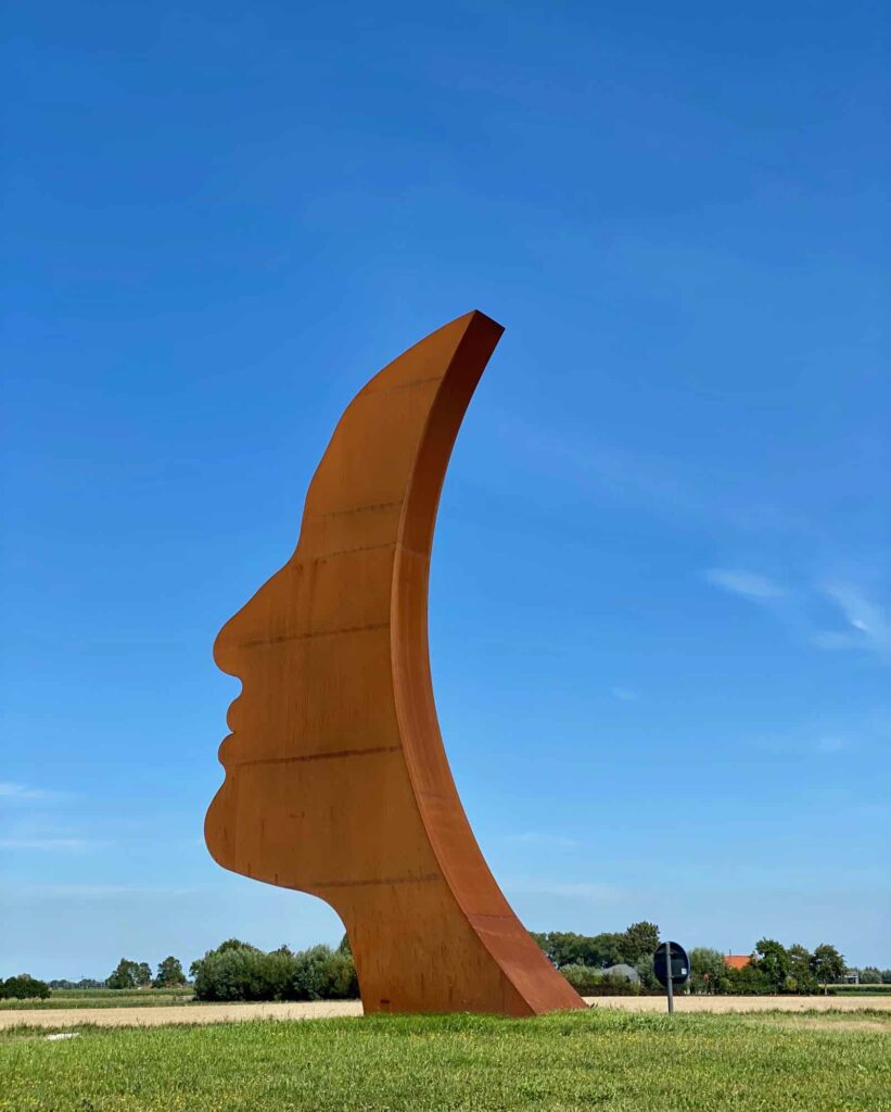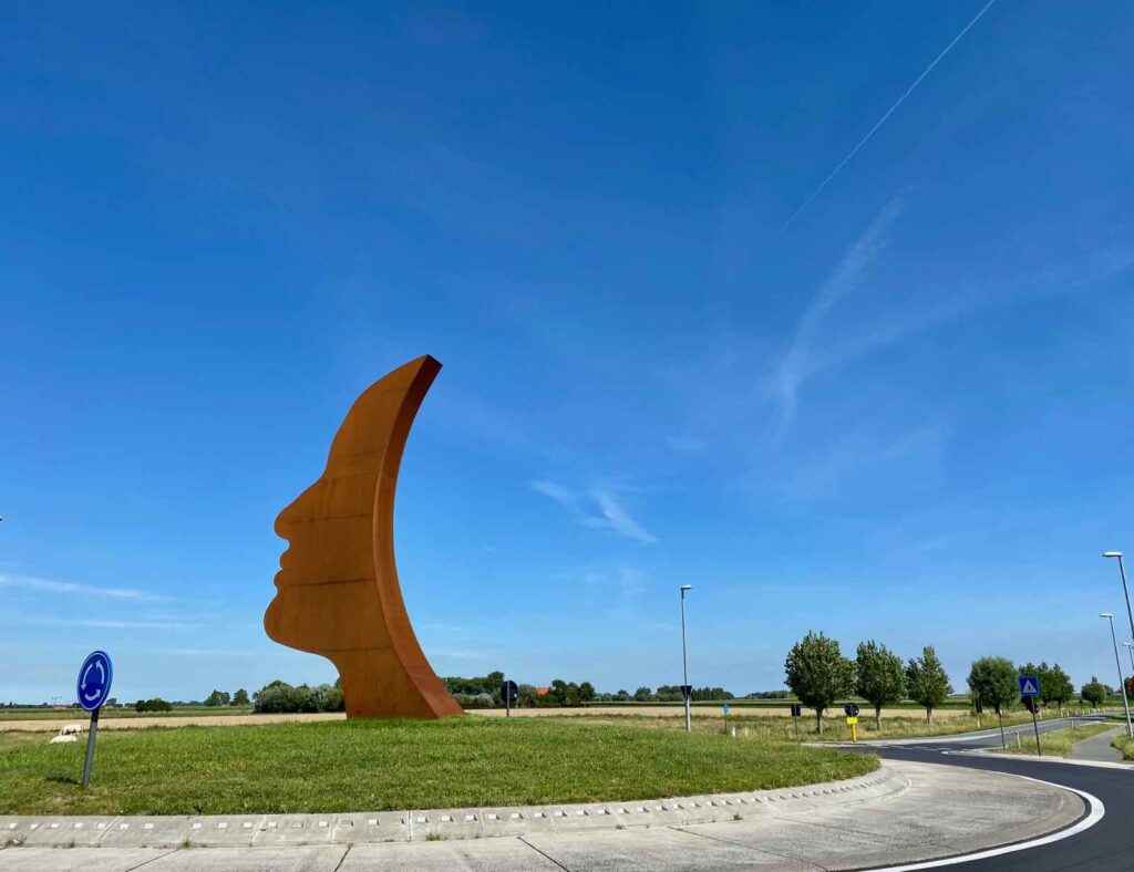 Pour trouver cette lune au profil très féminin, il faut s’éloigner de la station et goûter au charme très campagne de Ramskapelle, commune associée de Knokke. C’est là, sur un rond-point de Heistlaan, qu’apparait Proud, œuvre du Belge William Roobrouck, connu pour ses sculptures en acier.