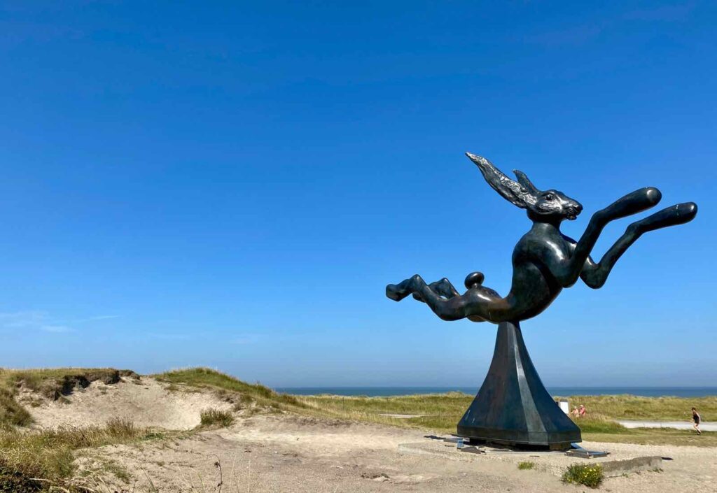 C’est un peu l’antithèse de l’œuvre de Catherine François. Une silhouette dynamique, libre et joyeuse, qui nous entraine dans le monde merveilleux de Barry Flanagan. Ah comme j’aime ce lièvre bondissant, qu’on croirait échappé d’Alice au Pays des Merveilles… Le sculpteur britannique a posé son animal fétiche sur Park Avenue à New York ou au Grant Park à Chicago. Mais n’est-il pas plus à sa place, ici, à deux pas du Zwin, dans cet environnement de dunes, de verdure et d’eau ?