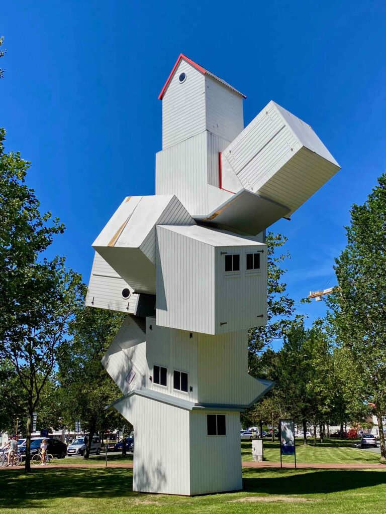 Encore une œuvre qui fait la part belle au monde de l’enfance. Encore une œuvre pleine de poésie et de nostalgie, comme j’aime ! Je me souviens de La Maison tombée du ciel, présentée à Lille, en 2012, dans le cadre de Fantastic. Voici Beach Castle, une sorte de totem imaginé par Jean-François Fourtou pour le festival Beaufort 2018. Ont-elles été emportées par le vent, lors d’une tempête comme la côte belge en connait ? On pourrait le croire, tant ces cabines semblent avoir été projetées en l’air avant de retomber, un peu pêle-mêle… L’idée d’utiliser ces petites maisons de planches est simplissime. Mais qu’importe puisque ce monument à la gloire du tourisme balnéaire amuse, interpelle, fascine ou fait sourire…