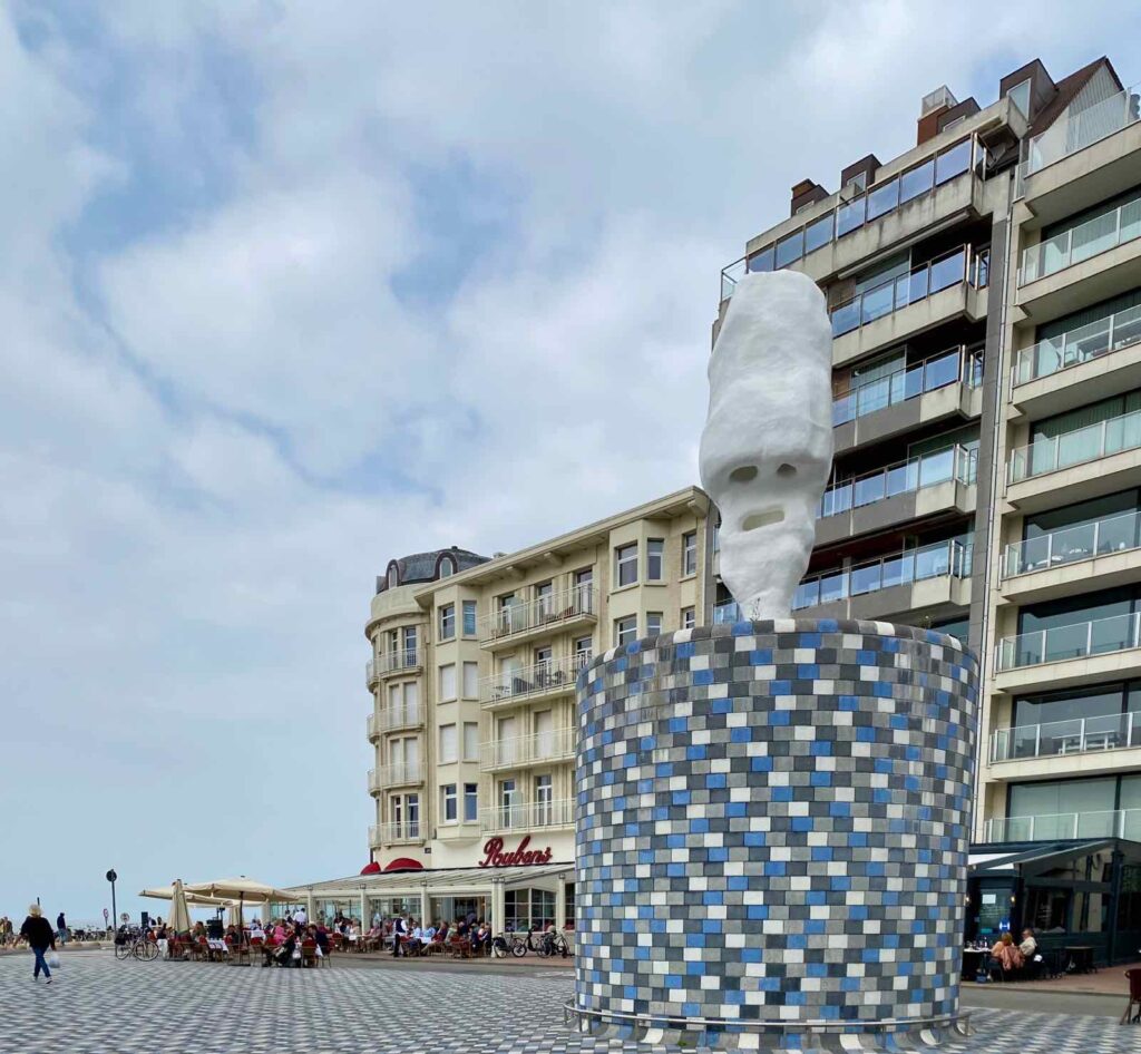 C’est en sortant de la brasserie Rubens (LIRE ICI), que j’ai photographié ces cylindres carrelés, surmontés d’impressionnantes têtes de 5 mètres de haut ! Elles sont l’œuvre de l’Autrichien Franz West, qui vit et travaille à Vienne et aime modeler le papier mâché. J’aime bien leur côté carnavalesque, qui m’a fait penser à James Ensor, un voisin d’Ostende bien connu…