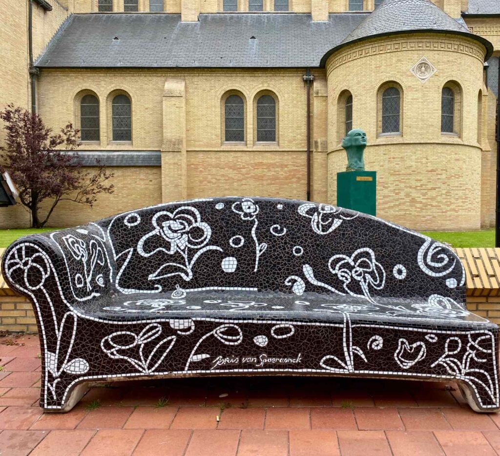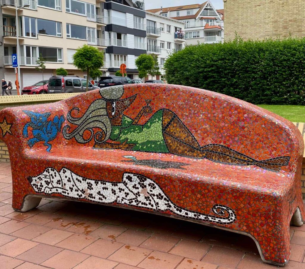 Ces bancs, installés en 2010 à Knokke, sont aujourd’hui réunis dans le jardin du centre culturel Scharpoord. Des canapés en béton, recouverts de mosaïque, qui incitent à se poser ou juste à admirer le travail minutieux d’une quinzaine d’artistes…