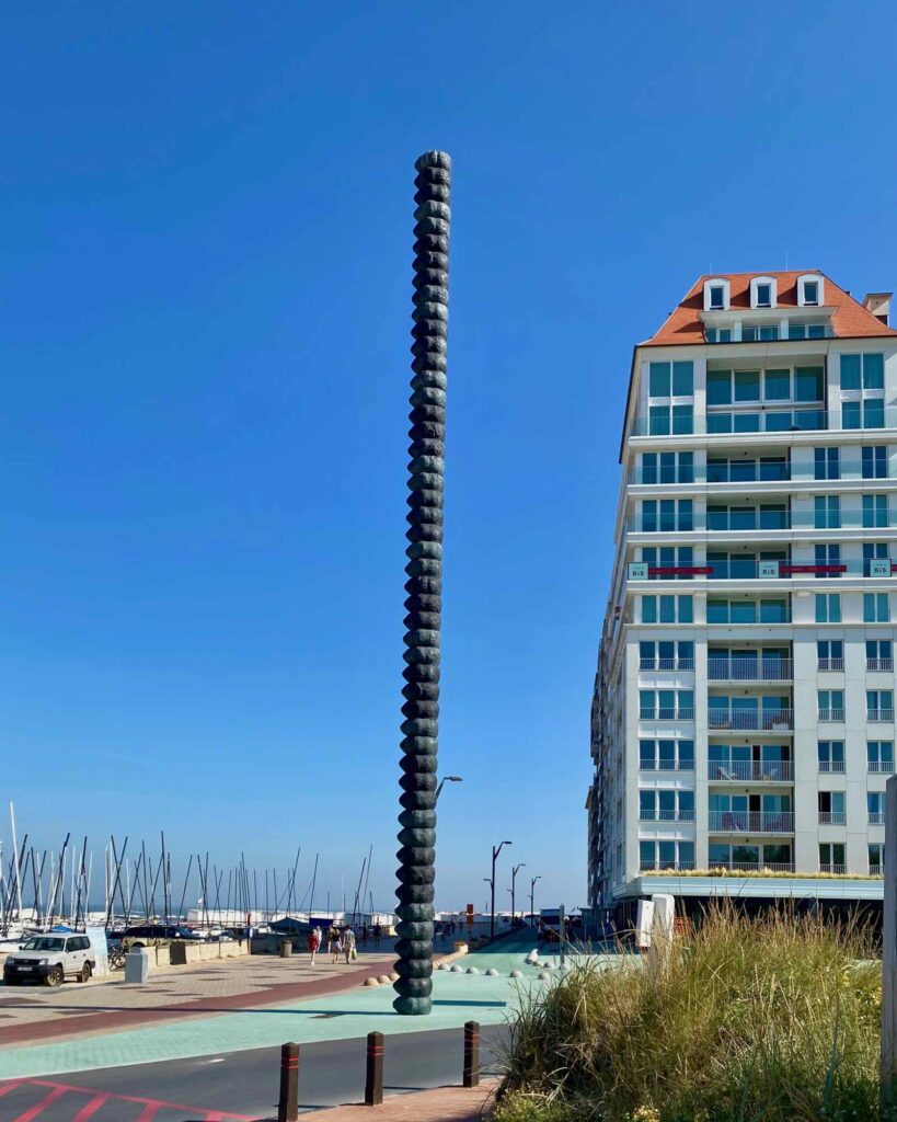 Je m’en veux, je m’en veux… Mais pourquoi ne me suis-je pas approchée de ce totem, signé par le Bruxellois Thomas Lerooy ? Je viens de découvrir (mieux vaut tard que jamais !) que cette Tower monumentale de 22 mètres de haut est constituée de 49 têtes en bronze. Cela aurait été chouette de les photographier de près… mais moi je me suis contentée de mettre en boîte l’immense colonne, se détachant sur le ciel azur. Grrrr…