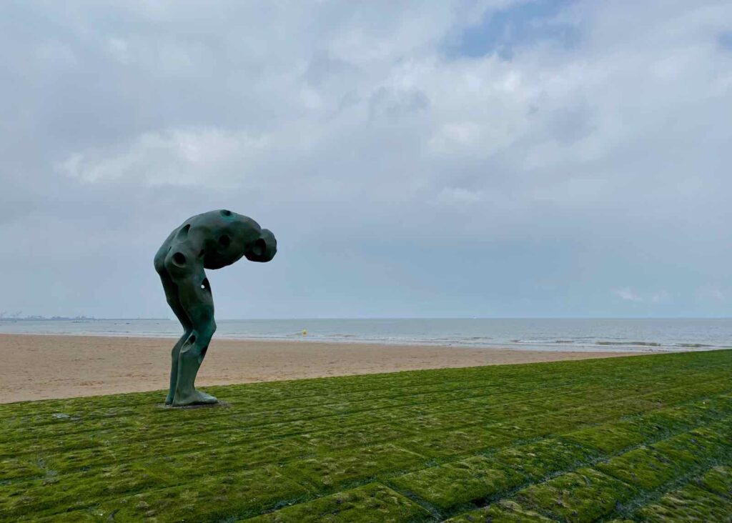 Encore une œuvre posée sur un brise-lames, encore un coup de cœur ! Bien sûr, cette sculpture criblée de trous, « expression d’une énergie destructrice », peut mettre mal à l’aise, courbée sous le poids d’un invisible fardeau. Mais comment rester insensible devant cette solitude et cette fragilité, face à la mer du Nord, qui happera ce corps à marée haute ? Connue pour ses bronzes monumentaux, Catherine François sait ressentir la nature comme personne et j’avoue qu’elle a réussi à m’émouvoir…