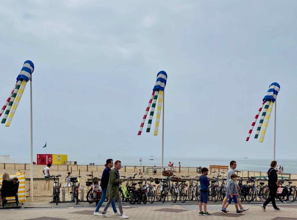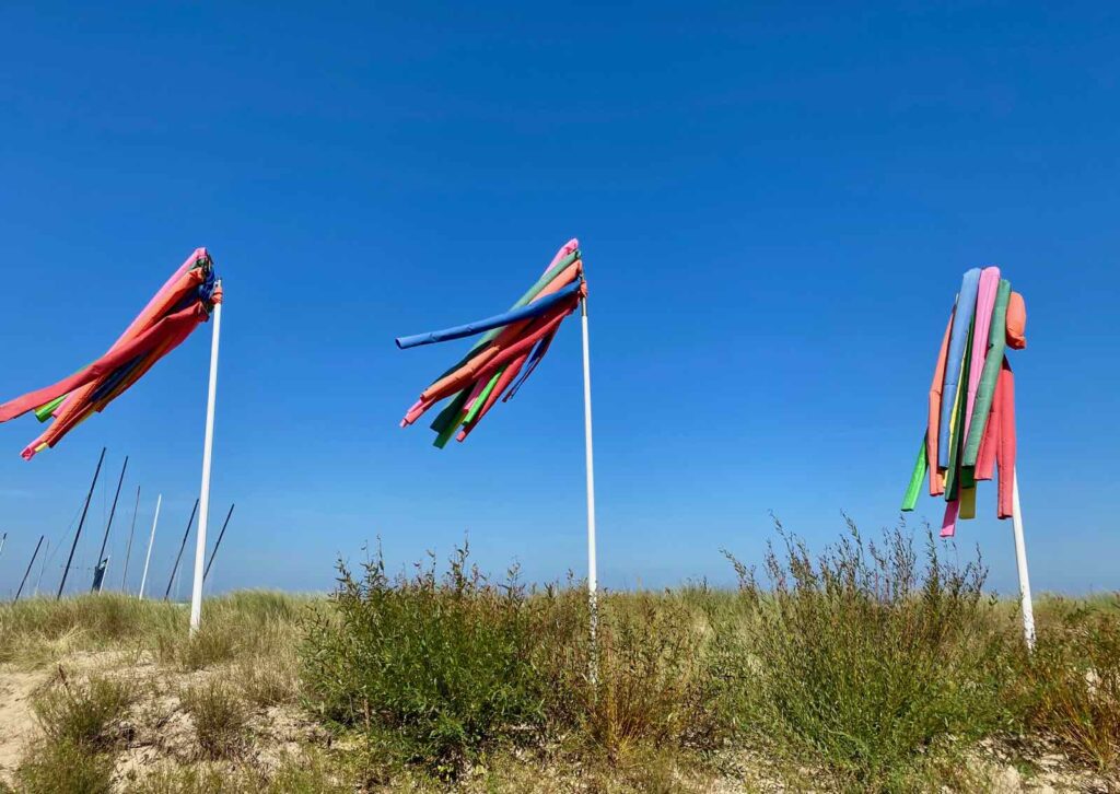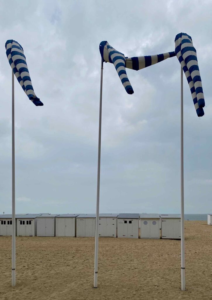 Si j’ai bien compris, on les enlève à la fin de l’été… et vous devrez donc attendre le printemps prochain pour les revoir. Les manches à air de la Belge Griet Dobbels sont-elles à proprement parler des œuvres d’art ? Je n’en sais rien mais j’aime assez ces formes colorées qui flottent, à dix endroits différents, dans le ciel de KnokkHeist. Trente Windsocks qui font penser à de grandes chaussettes, c’est vrai…
