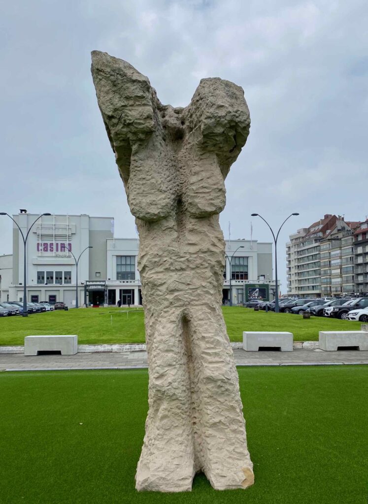 Vous l’aurez compris, ce n’est pas l’œuvre que je préfère à Knokke… loin de là. Mais puisque je l’ai mise en boîte, je vous donne cette figure signée Eugène Dodeigne, installée devant le Casino depuis les années 70. Massive et rugueuse, cette Eva, en pierre de Bourgogne, a de petits airs de menhir. Vous ne serez pas étonnés quand je vous dirai que le père de Dodeigne était tailleur de pierre…