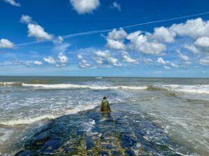 Knokke-Brise-lames-De-Zee-die-Grote-Beeld-Houwer-Jean-Michel-Folon-vu-de-derriere-ciel-nuageux