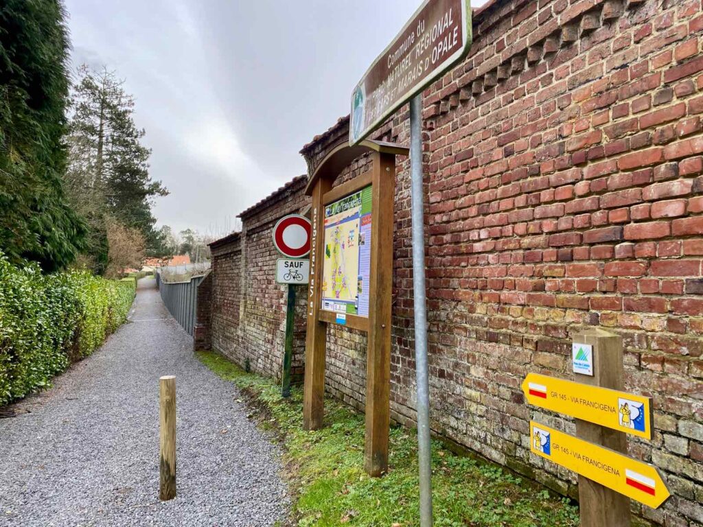 Là, tournez à droite sur la départementale. Puis reprenez la rue de Wisques, à gauche, qui dans ce sens grimpe pas mal… À partir de là, vous reviendrez sur vos pas jusqu’au point de départ de notre rando sur la Via Francigena.