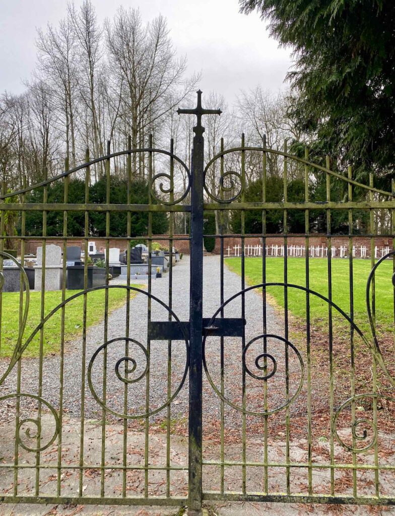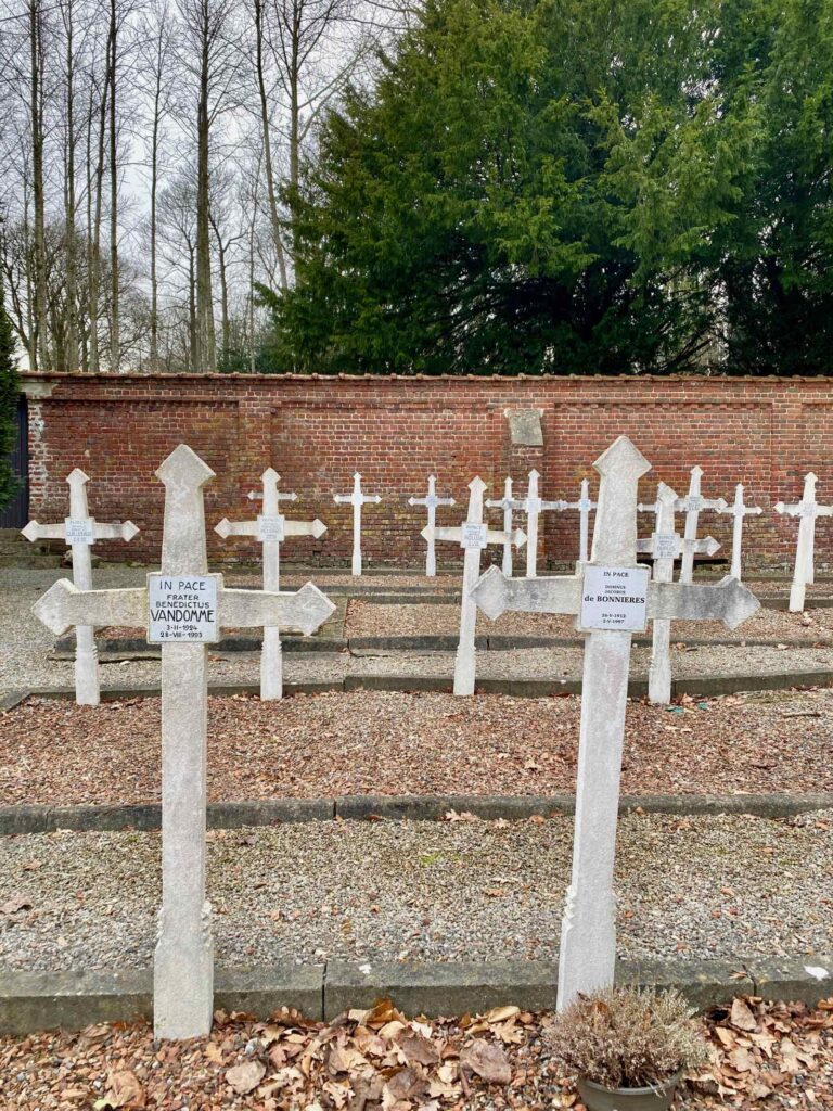 C’est toujours tout droit, sur la D212, entre l’abbaye Saint-Paul et le centre de Wisques. Avant un grand virage, sur votre droite, vous verrez le cimetière, avec sa grille noire. À côté de la partie « civile », toute une série de tombes de moines.