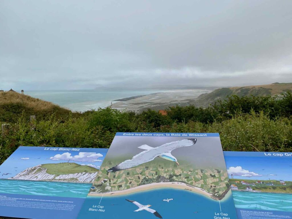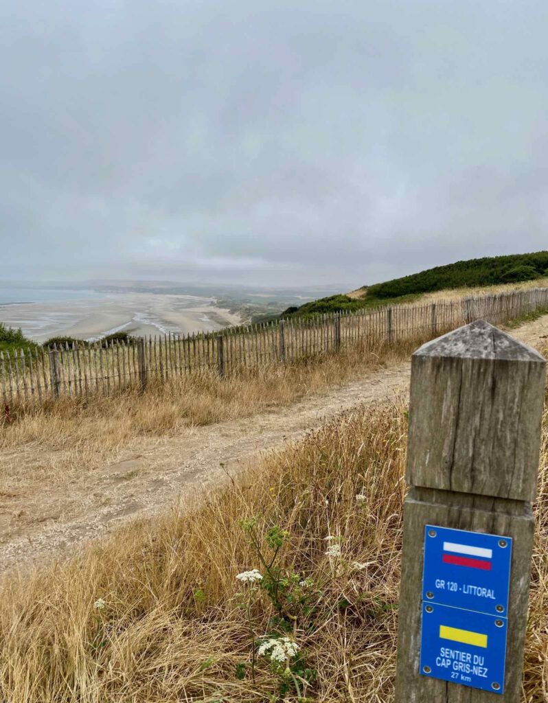 Avant d’attaquer le GR® 120 proprement dit, on part sur la droite et on marque une petite pause au belvédère de la baie. De là, on domine toute la baie et on devine à peine le Cap Blanc-Nez, perdu dans les nuages. Même si le temps n’est pas au grand bleu, la balade promet d’être belle…