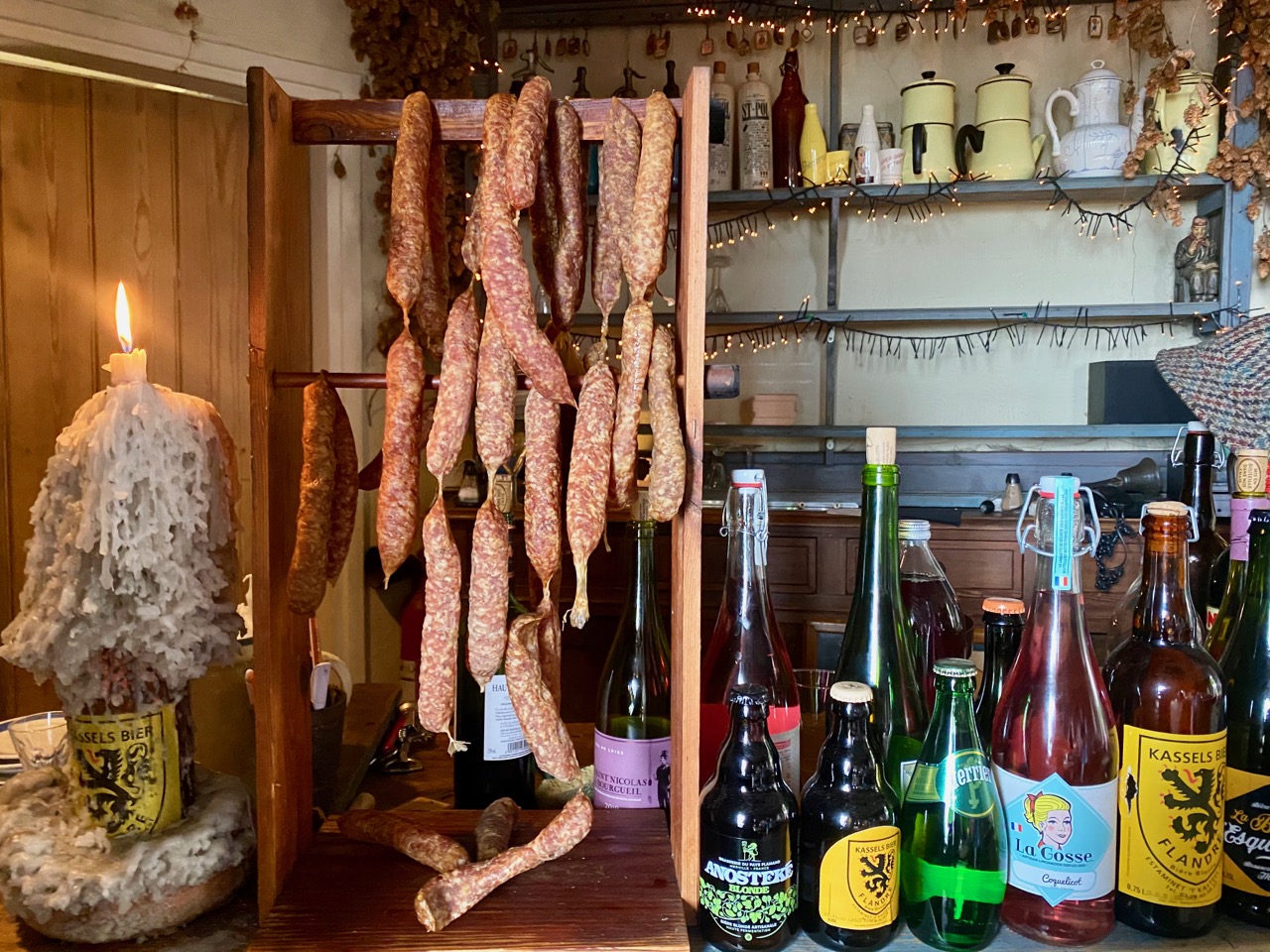 Bon, tout cela pour vous dire que j’adore ce coin, indissociable de ’T Kasteelhof, qui trône tout en-haut de la petite montagne, accroché comme un balcon au sommet du mont Cassel. Derrière sa façade jaune, se cache l’un des estaminets les plus emblématiques de Flandre. Le plus connu sans doute, même si ce n’est pas ma table préférée.