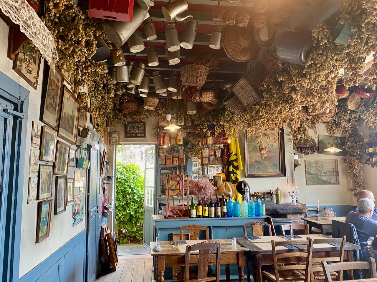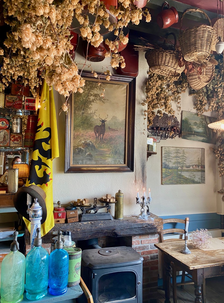 Des pots à lait, des cafetières, des moulins à café, des paniers, d’anciennes plaques publicitaires, des bouquets de houblon séché, des tableaux… franchement j’adore… même si je n’aimerais pas trop y faire le ménage !