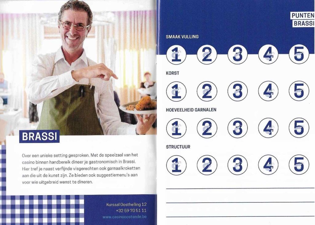 Pour aider le gastronome, les organisateurs ont réalisé un petit livret, offert à chacun à l’entrée. Pour chaque resto en compétition, une page permettait de noter, de 1 à 5, quatre items différents : le goût de la farce, la croûte, la quantité de crevettes et la structure.