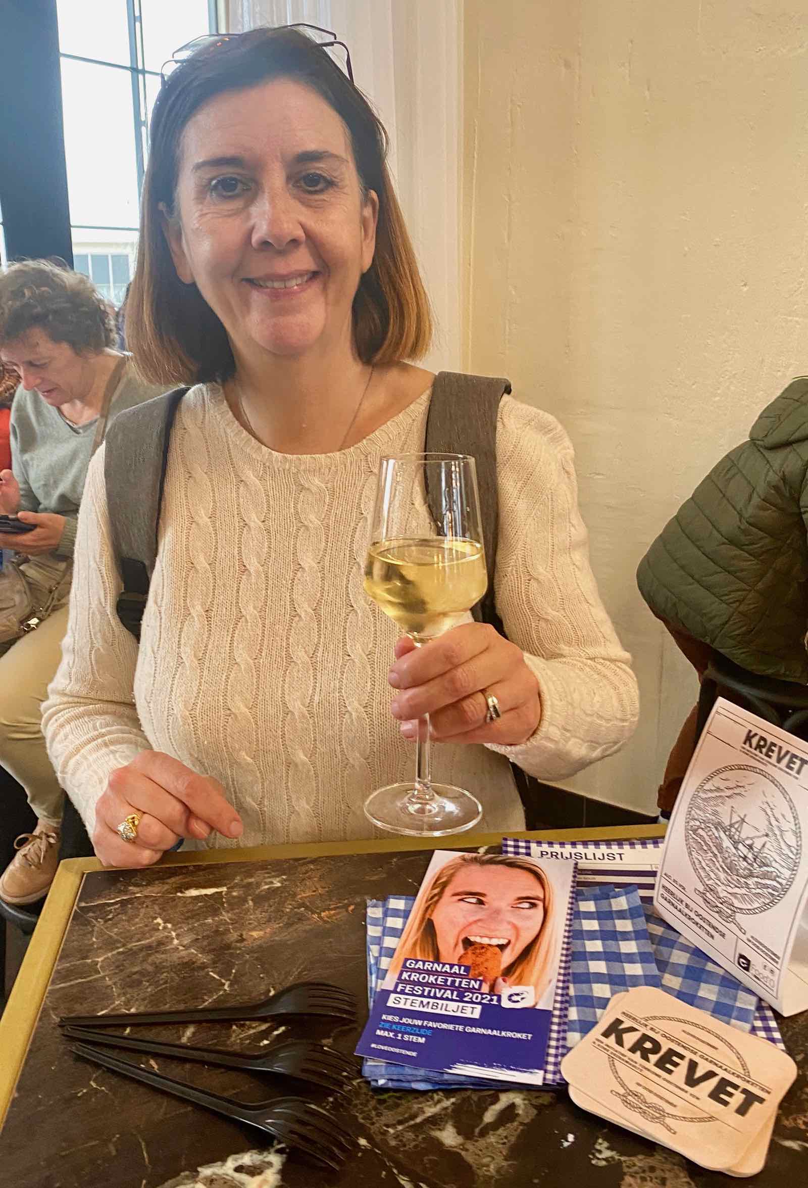 Festival-des-Croquettes-de-crevettes-Ostende-femme-avec-verre-vin-blanc