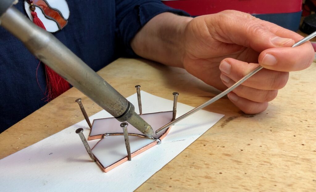 8. Les pièces sont assemblées au fer à souder avec une baguette d’étain. L’opération est réalisée sur les deux faces de l’objet.