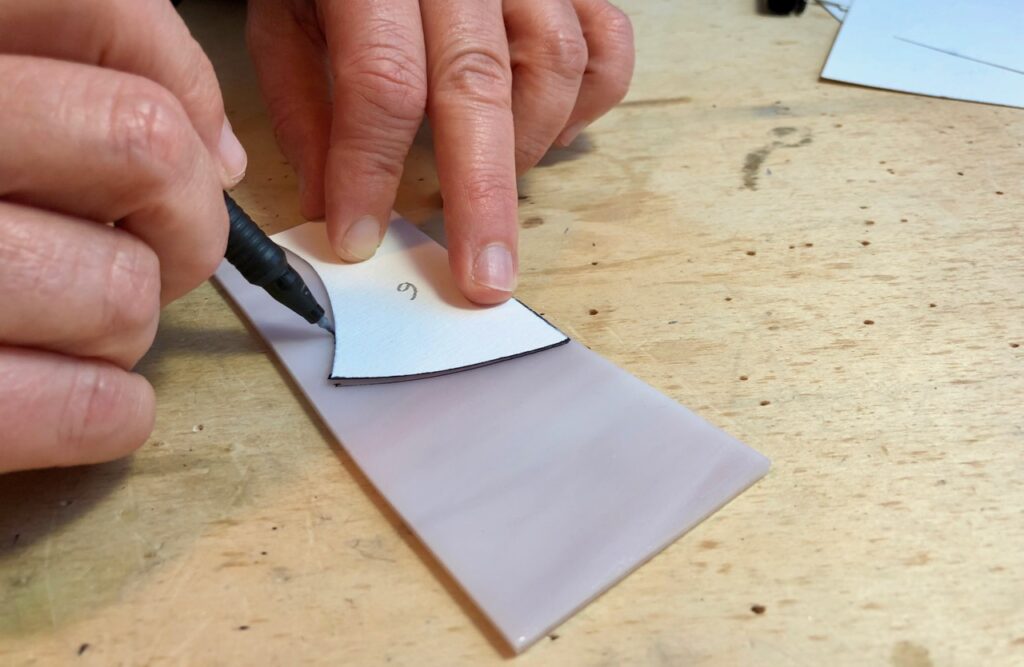 3. Chaque gabarit est posé sur le verre et détouré avec un feutre indélébile.