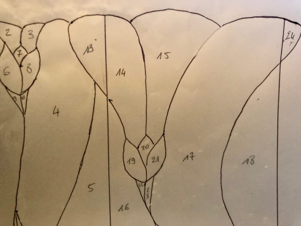 2. Ce dessin sera transformé (avec des ciseaux spéciaux) en gabarits de papier Canson, autant qu’il y a de pièces à réaliser.