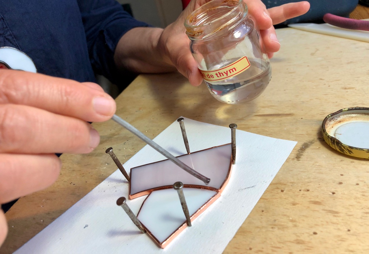 Verronimo fabrication vitrail Tiffany decapant cuivre