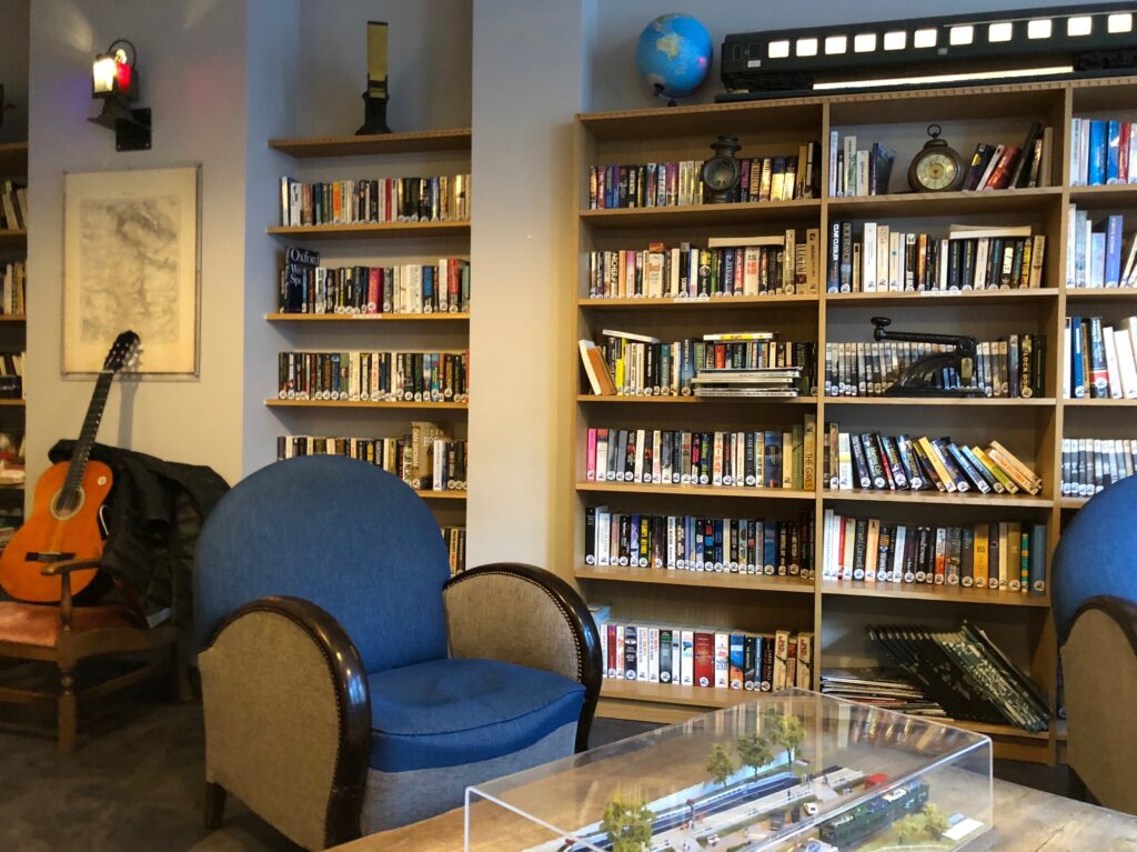 Il y a aussi un salon chaleureux et convivial, avec une grande bibliothèque, où on peut emprunter un bouquin pour la soirée. Bonne ambiance et bonnes vibrations dans ce lieu qui est un peu le coeur de la grande maison. Et qui sait si, comme dans un ancien compartiment, on n’y fera pas de jolies rencontres. La vie est parfois un drôle de voyage…