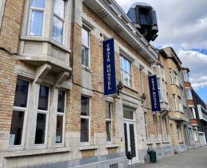 Façade Train Hostel à Bruxelles Belgique – wagon sortant mur