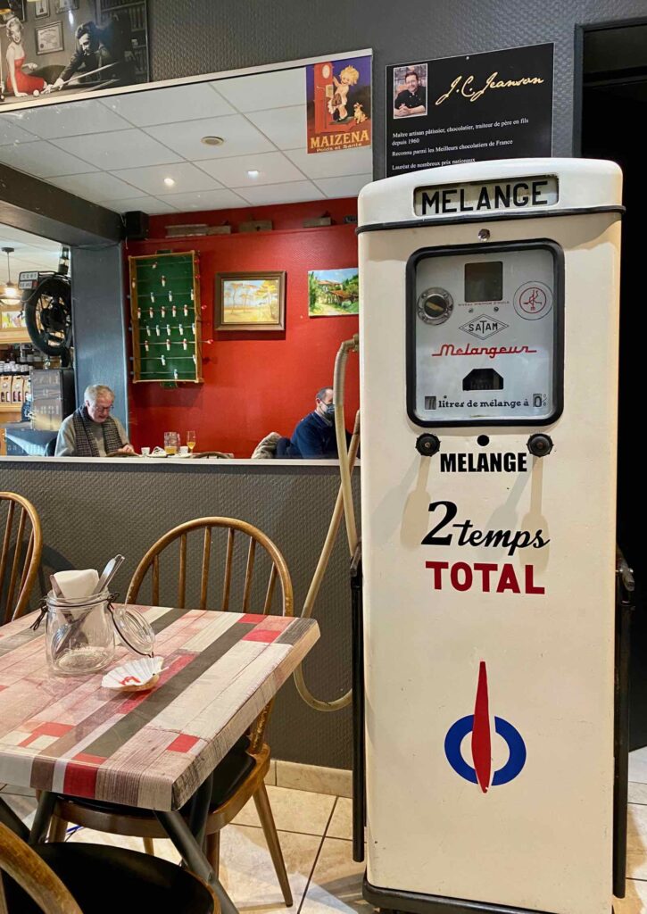 Côté déco, précisons que le père de Justine a la passion des motos anciennes et autres vieux objets… dont elle a visiblement hérité. Casque de mineur (pensée douce pour mon grand-père qui devait porter le même, à deux pas de là), pompe à essence ou vieilles motos, la brasserie Saint-Théodore a de petits airs de brocante… D’autant que les tables ont été chinées dans un ancien resto, tandis que les chaises ont été récupérées auprès d’une asso locale. Recyclage à fond !