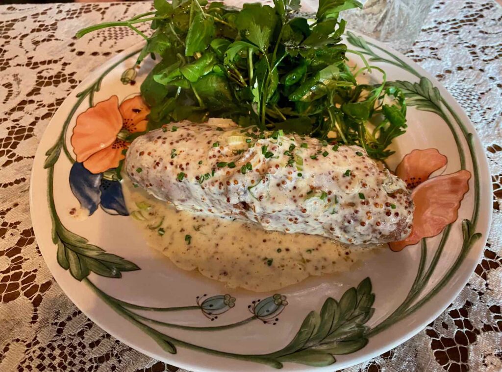 Nous avons commencé par une terrine au maroilles maison (7,50 €), la seule encore disponible. La chose s’est avérée délicieuse, très fraîche et pleine de goût. Accompagnée en plus de bon pain croustillant. Et d’une bonne Anosteké aussi.