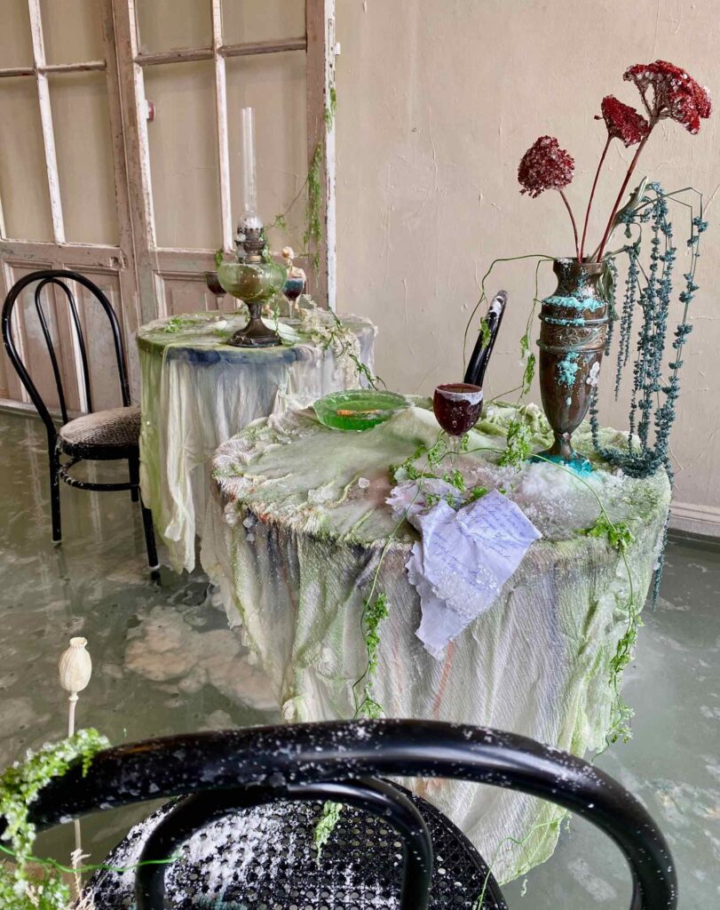 Un cabaret du XVIIIe, avec ses tables, ses rideaux de velours, ses verres encore pleins et ses fleurs fânées. Un monde comme suspendu, où seul l’invisible est encore présent et où la nature a repris ses droits.