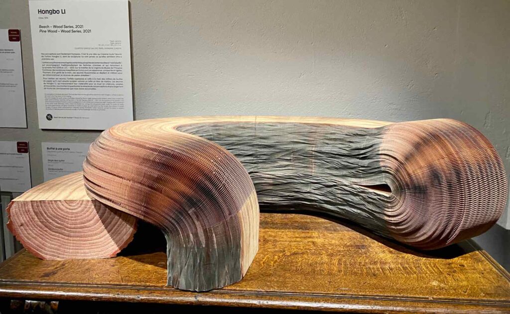 Un petit panneau demande de ne pas toucher. Mais, j’avoue (honte à moi), j’ai touché, caressé, palpé cette œuvre aussi belle qu’étonnante. Vous croyez que l’artiste chinois Hongbo Li présente ici un tronc, compact et dur, surfant sur la fibre très nature d’Utopia ?