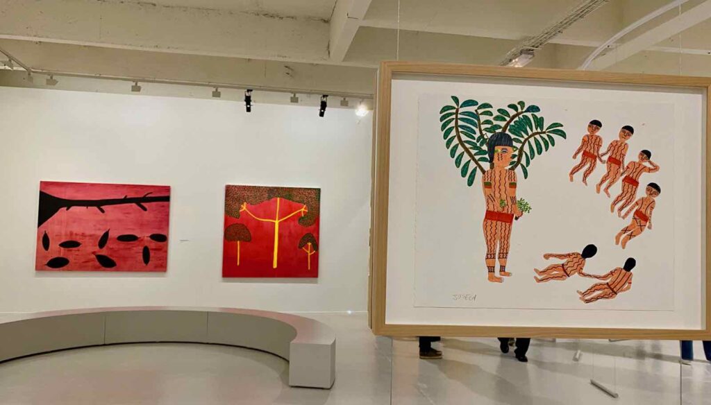 Animaux, mythes, vie quotidienne dans la forêt sont les principaux sujets des dessins qu’il présente au Tripostal, dans le cadre de l’expo Les Vivants. Grâce à sa traductrice, il les a commentés pour les premiers visiteurs d’Utopia. Je l’ai religieusement écouté, avec cette impression bizarre que nos âmes n’avaient pas besoin de mots pour communiquer…