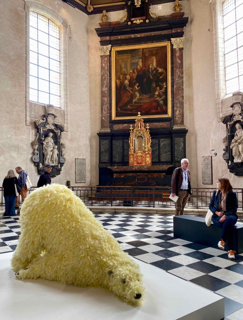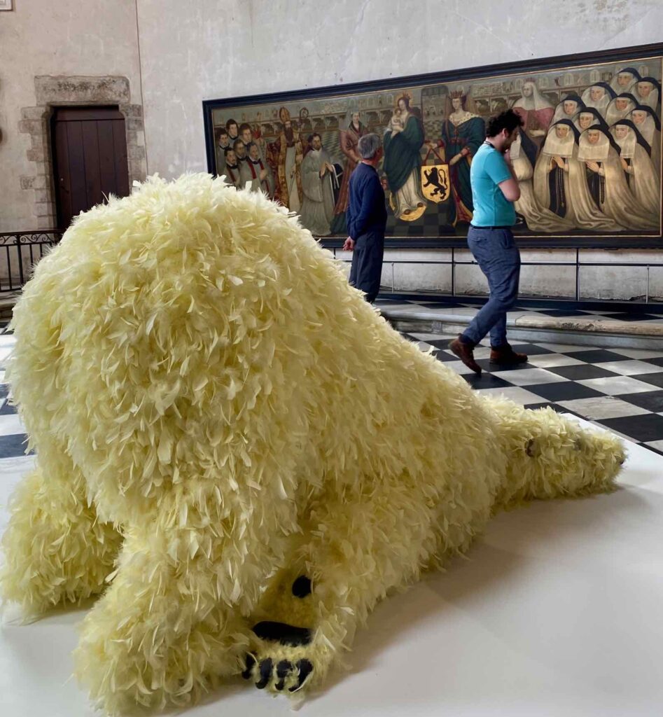 Est-ce le message de l’artiste italienne Paola Pivi, qui propose cette magnifique sculpture habillée de plumes ? Dans cette saison culturelle Utopia, qui plaide pour le respect de la nature, j’ai supposé que oui. Ici, dans l’ancienne chapelle de l’Hospice Comtesse, ne reste-t-il plus qu’à prier pour la survie de l’ours blanc ?