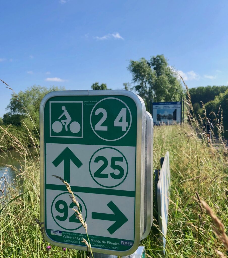 Regardez par exemple ce panneau. Le 24 est le point où on se trouve, en bord de Lys. Tout droit, on pédale vers le 25. À droite, on part vers le 92. Simplissime, non ?