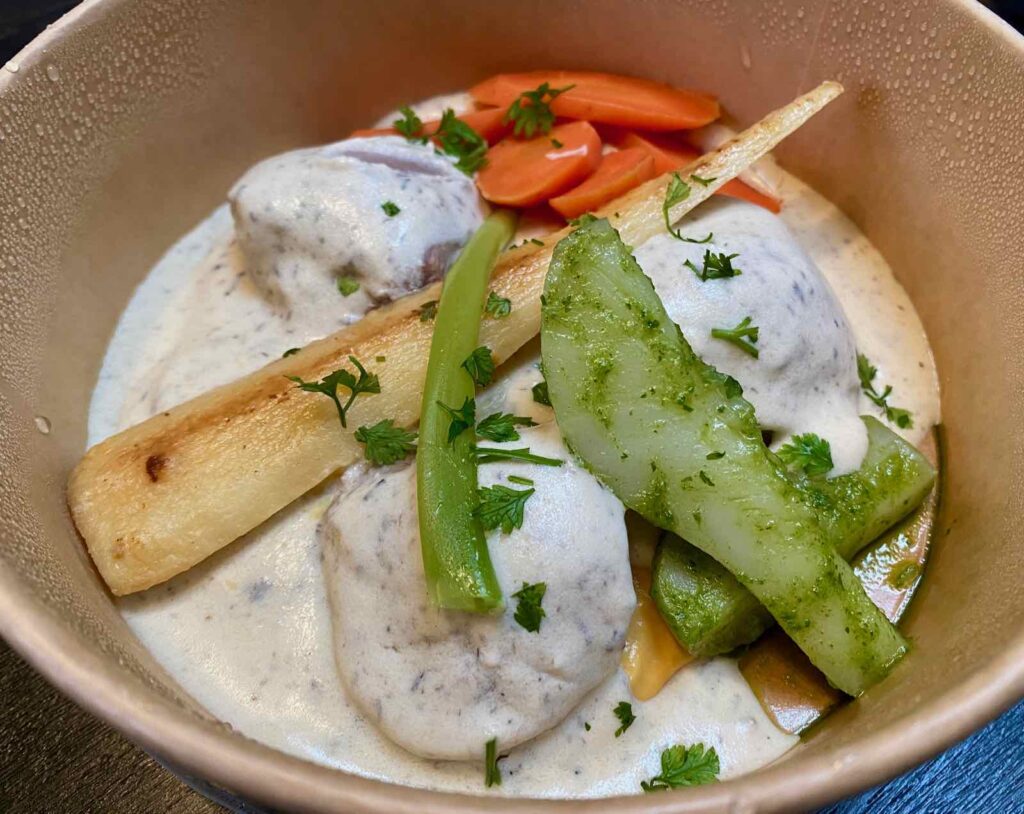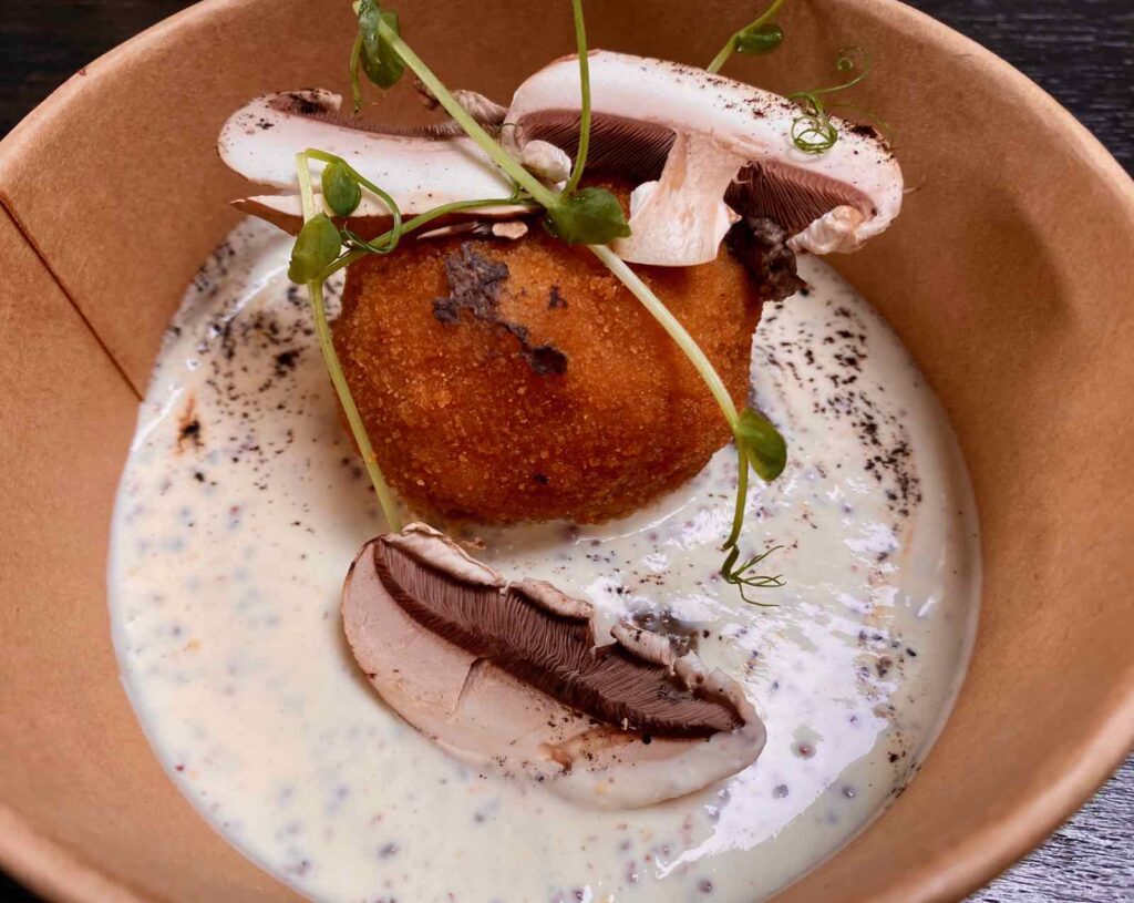 Cette semaine-là, en entrée, j’ai particulièrement été attirée par l’arancini jambon cru, champignons, crémeux de champignons et sauce moutarde à l’ancienne. J’adore ce genre de boulette, faite à base de risotto, plus encore quand elle repose sur un goûteux crémeux de champignons.