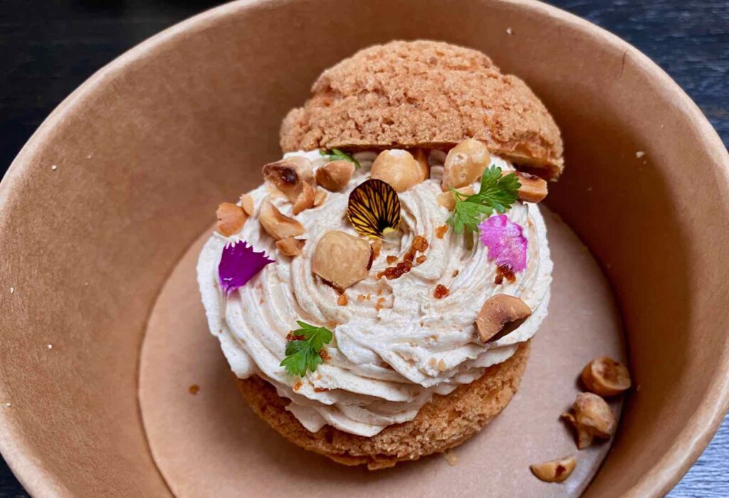 Mon penchant naturel m’aurait plutôt conduite vers la tarte au citron déstructurée, aussi jolie à regarder que délicatement acidulée. Mais je dois avouer que le chou façon Paris Brest avait aussi de sacrés arguments…