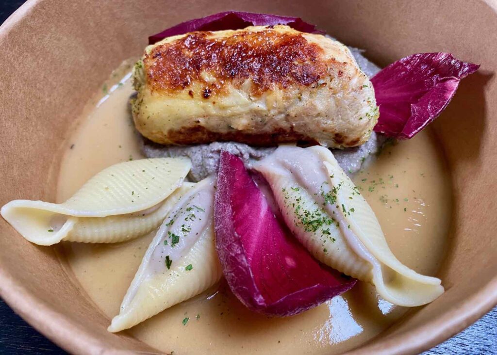 Sur le menu, j’avoue que l’autre plat, le coquelet désossé farci, conchiglionis aux topinambours café, houmous de lentilles, chips de topinambours et jus de volaille m’avait fait un peu peur. À cause du coquelet, une bestiole pleine de minuscules os, que seule ma grand-mère réussissait à déshabiller comme il faut.