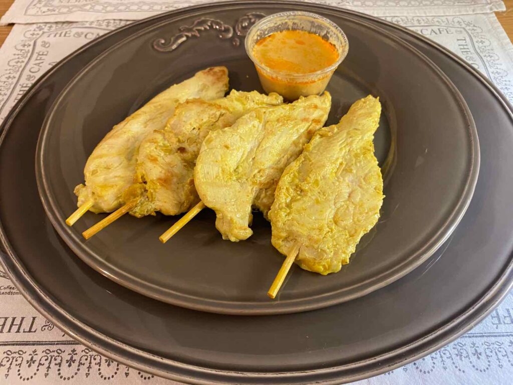 Avec ma co-testeuse du soir, nous avons commencé par partager des brochettes de poulet à la sauce saté (Kaï Saté, 7 €) et une salade de crevettes aux légumes croquants (Yam Kung 8,80 €).