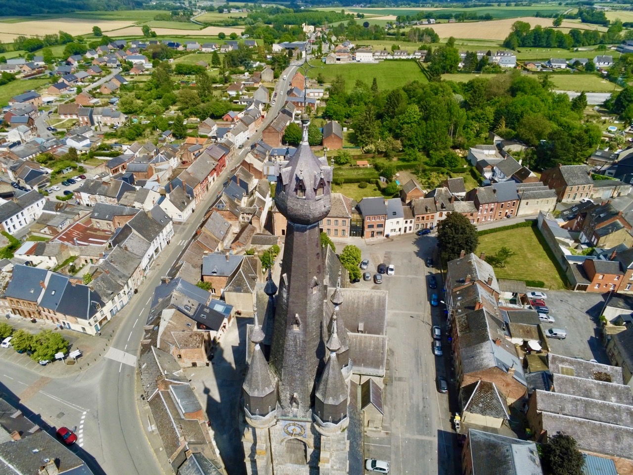 Flèche de l’église de Solre-le-Château vue de près au drone