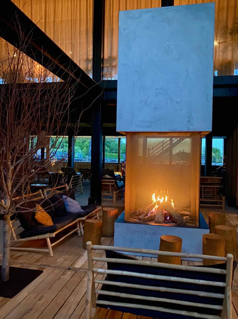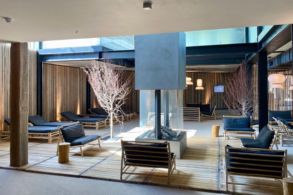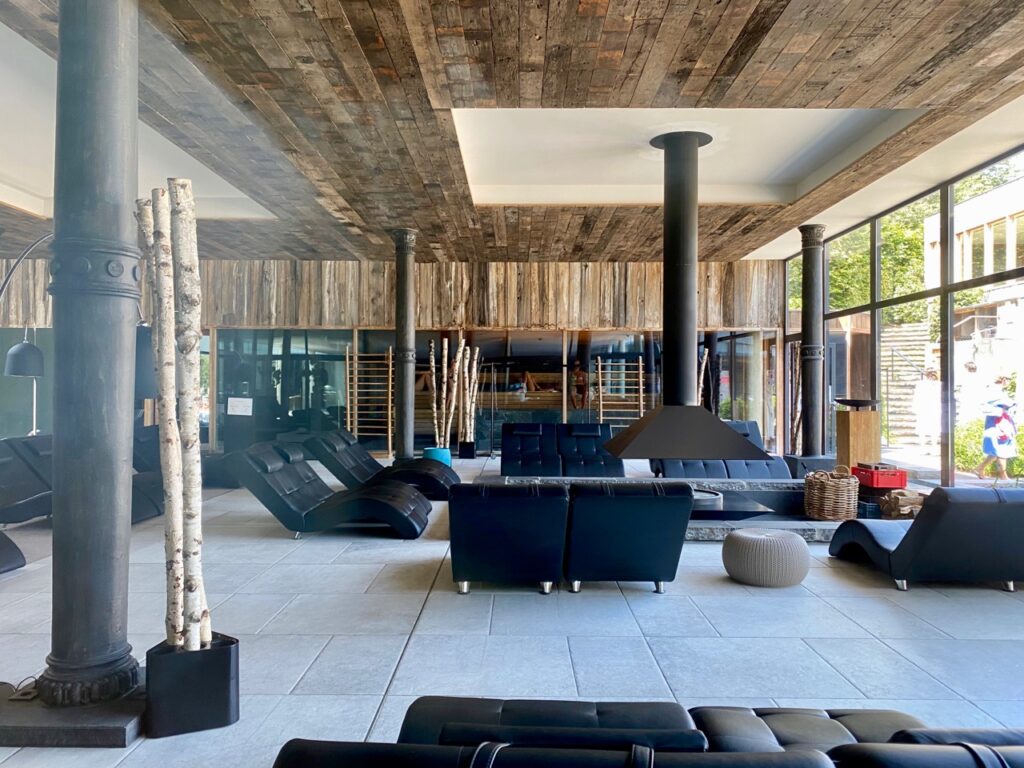 Bon, parlons un peu des installations à présent. Dans la zone Unite de l’espace maillot, la salle de repos, avec sa belle cheminée, était fermée ce jour-là. Mais nous avons bien profité du grand bassin intérieur ainsi que de la piscine intérieure/extérieure, qui donne sur le jardin.