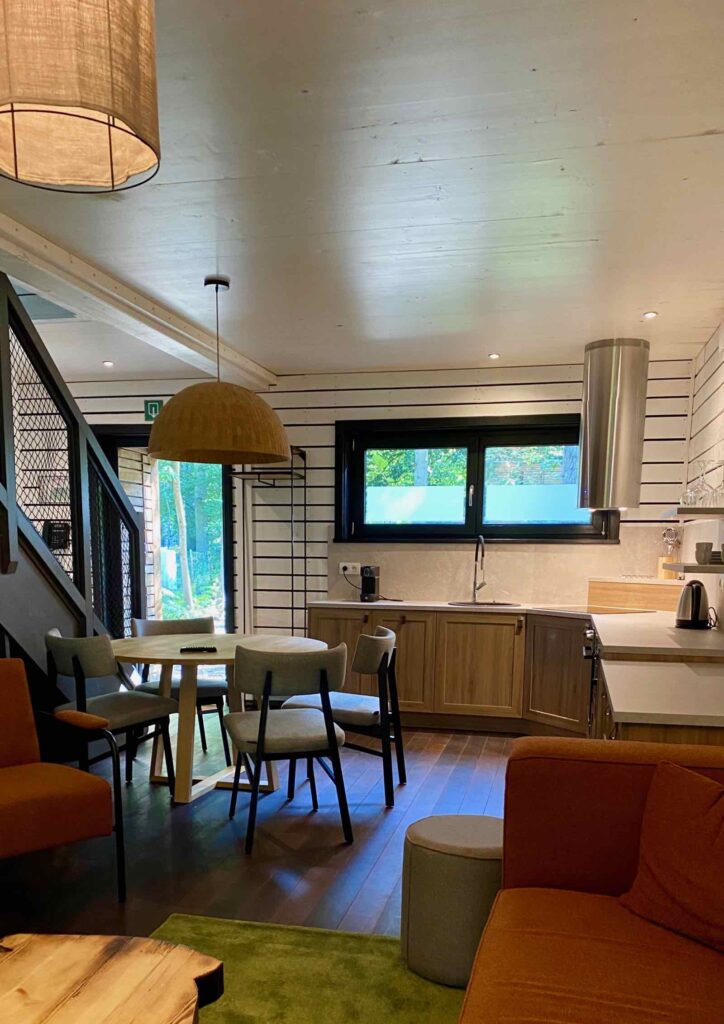J’aime beaucoup le grand espace du rez-de-chaussée, entre cuisine, salon avec poêle à bois et petite terrasse posée entre les branches de la forêt !