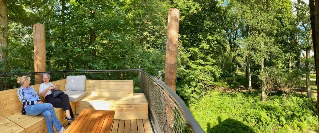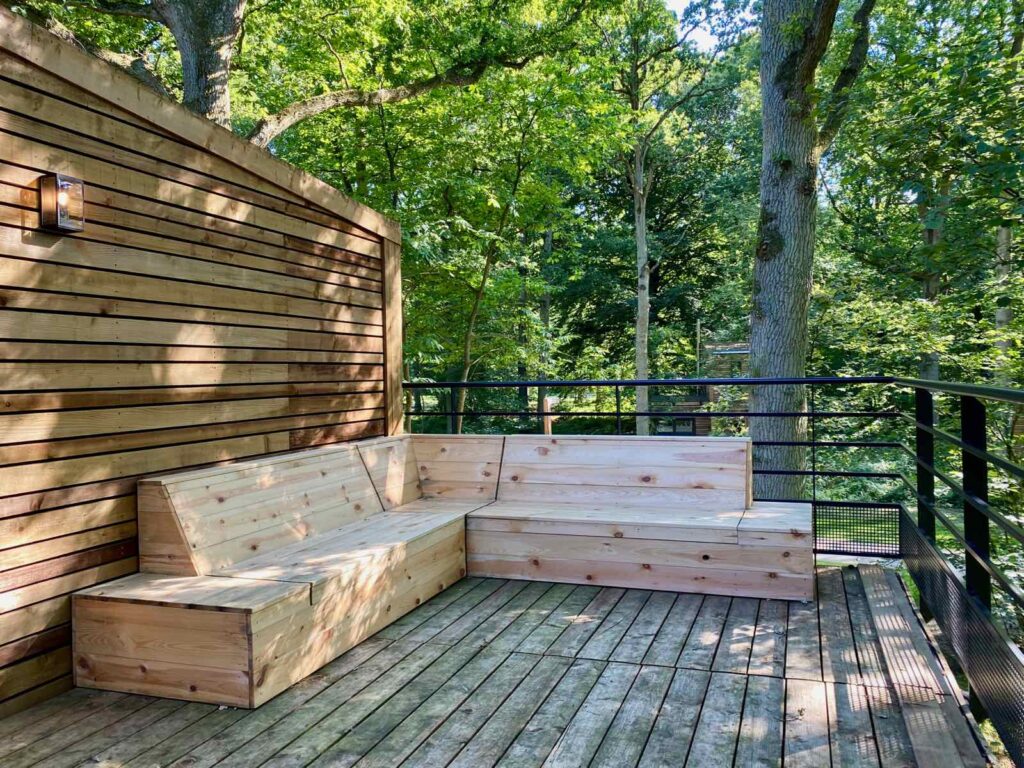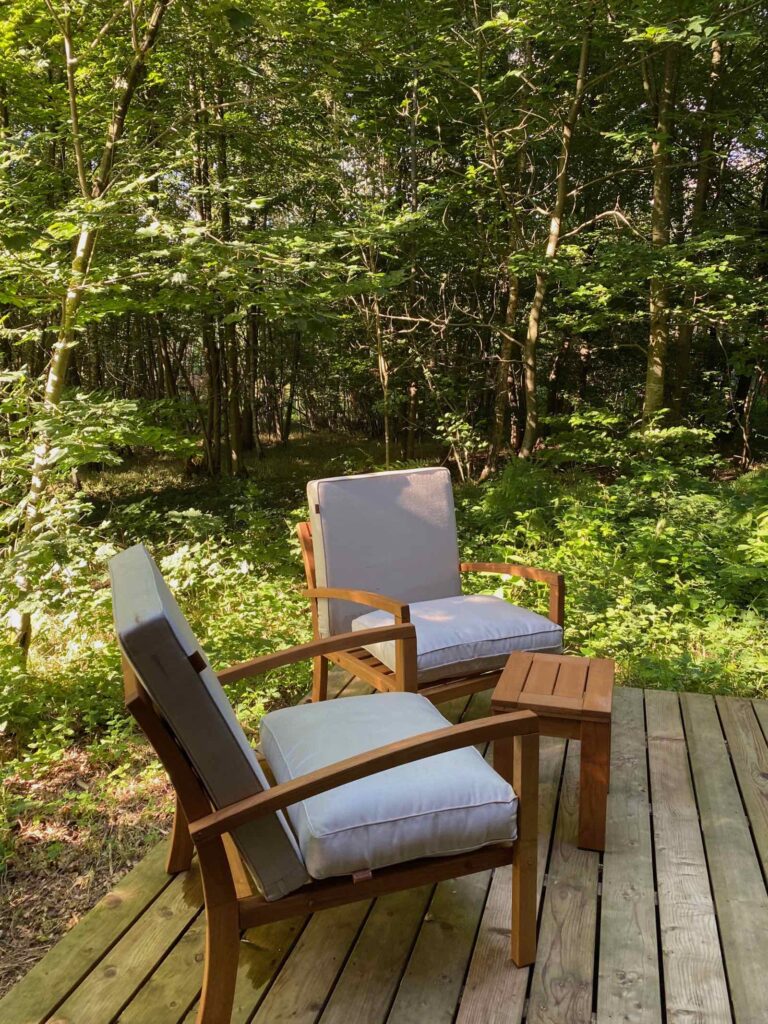 Sur le toit, une grande terrasse, qui offre un mobilier d’extérieur en bois brut et une vue panoramique sur la forêt. Après une grimpette bien raide sur un escalier en pas japonais.