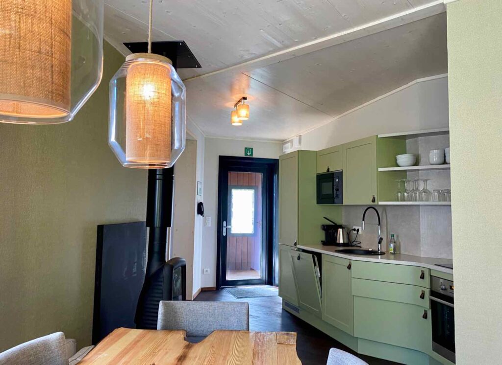 À l’intérieur, des espaces pas immenses mais cosy et largement vitrés. Un salon avec poêle, deux chambres, une cuisine, une salle de bain et le clou : un vrai sauna, luxe ultime dans une cabane !