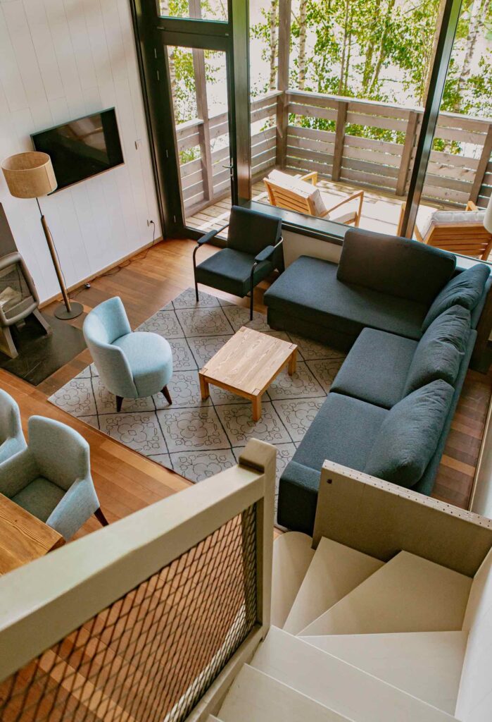 Avec ses 2 ou 3 chambres, la Lake House est une vraie maison en duplex, avec un séjour double hauteur (forcément), un feu de bois et une déco très élégante. Et même une petite lucarne pour regarder l’étang à partir de son lit. Bref j’adooore et je rêve d’y séjourner en famille.